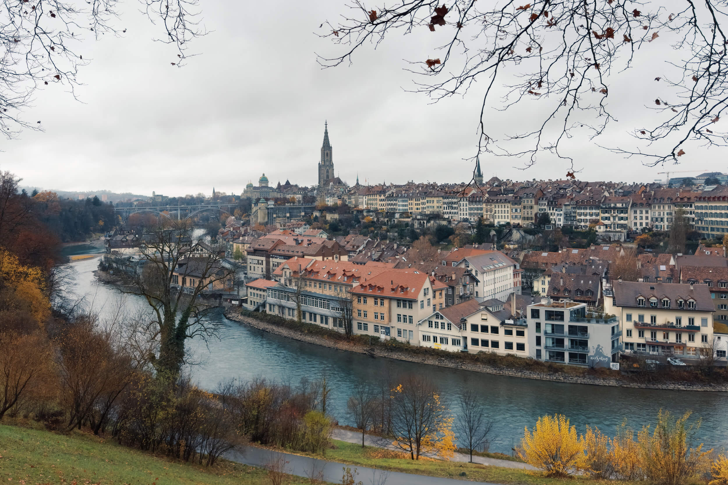 Finally immersing myself in the November gray. A short walk through Bern was perfect for this. Discovering and admiring the structures of the leafless trees. Like the first green leaves in spring, I find the suddenly visible branches at the start of the season exciting and interesting. A completely different impression of the trees that were still leafy. Instead of colorful and soft, suddenly branched, reduced in color and rich in contrast. And yet they are both impressions of the same thing. The muted color palette also extends to the entire city on a wet November day like this and has a calming, harmonious effect in its own way.